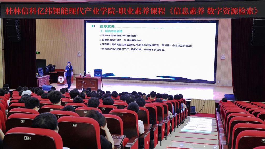 为提升学生的信息检索能力,促进现代产业学院的课程性质升华,4月4日,桂林信科亿纬锂能现代产业学院在51206报告厅开展“信息素养-数字资源检索”专题培训,此次培训邀请学校图书馆王凌燕老师授课,现代产业学院220名学生参与了培训。