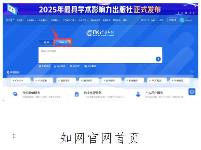在校园网IP地址范围内登录知网首页www.cnki.net,切换至CNKI AI进入;您也可以直接输入https://ai.cnki.net/进入。进入后点击个人登录(如没注册,可直接申请注册)