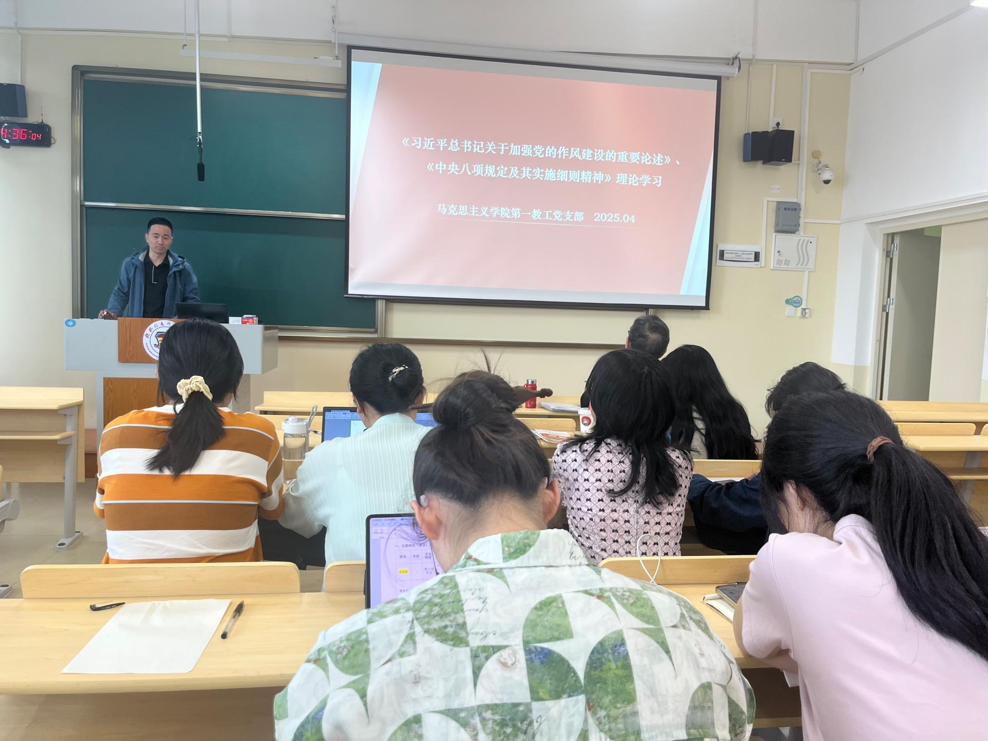 马克思主义学院第一教工党支部于4月25日在C513教室开展了《习近平关于加强党的作风建设论述摘编》专题学习。会议由党支部书记吴敏波老师主持,支部全体党员教师参加。