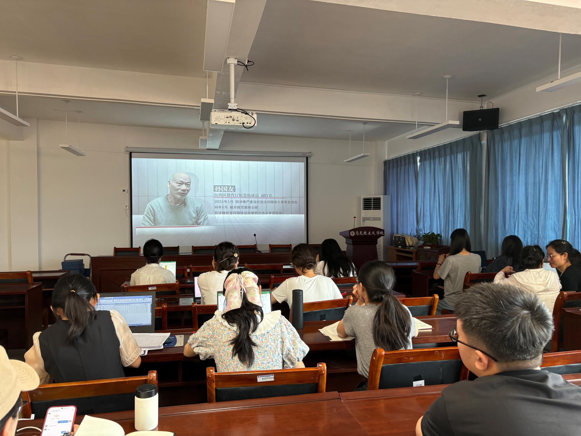 本次活动以“深学细悟强作风,以案为鉴树新风”为主题,着重推进思想铸魂与警示教育的结合。吴敏波书记深入学习贯彻习近平总书记关于党的建设的重要思想,通过领学与研讨的方式,引导全体党员深刻领会“坚持党的自我革命引领社会革命”“坚持严密党的组织体系”等核心论断。随后,支部组织全体党员集中观看了警示教育片《净土不容玷污——广西教育系统腐败典型案例警示录》。片中披露的权钱交易、学术腐败等案例触目惊心,深刻揭示了“破法始于破纪”的教训,为全体党员敲响了廉洁警钟。