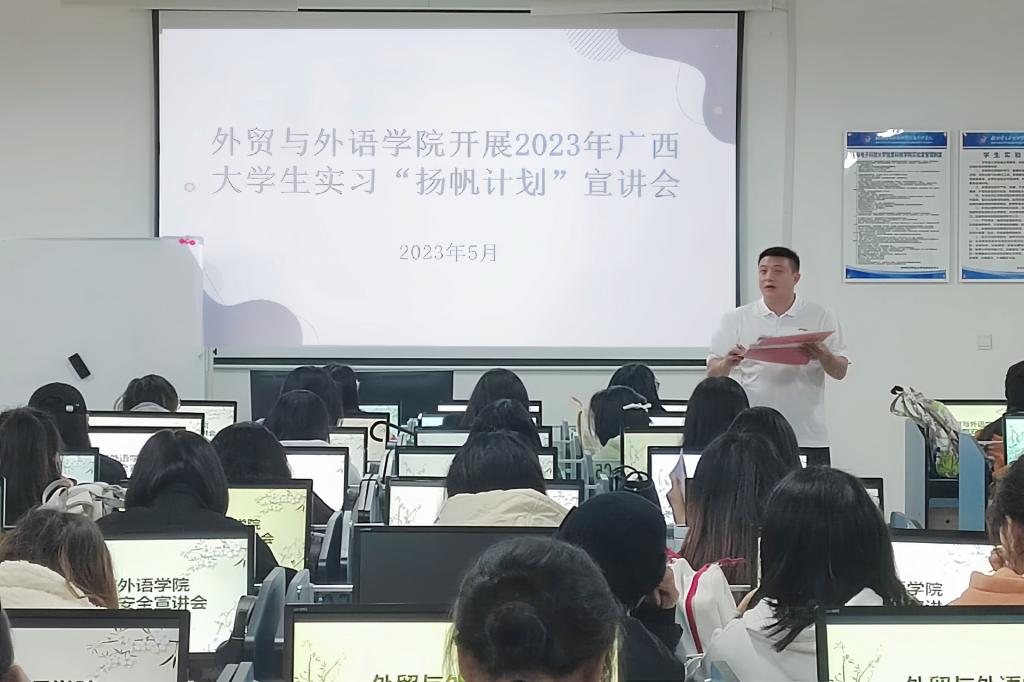 为做好2023年广西大学生实习“扬帆计划”工作,5月10日,外贸与外语学院召开2023年广西大学生实习“扬帆计划”宣讲会,会议由2020级辅导员蒋勇主持,全体2020级学生参加。会上,蒋勇老师首先介绍了“扬帆计划”分为政务实习、企业实习和职场体验活动三种模式,并逐一进行说明。随后,蒋勇老师就当前的就业环境和就业趋势进行分析,鼓励大家积极参加实习,以此了解相关的工作流程、技能和职场文化,培养自身实践能力,提前为自己...