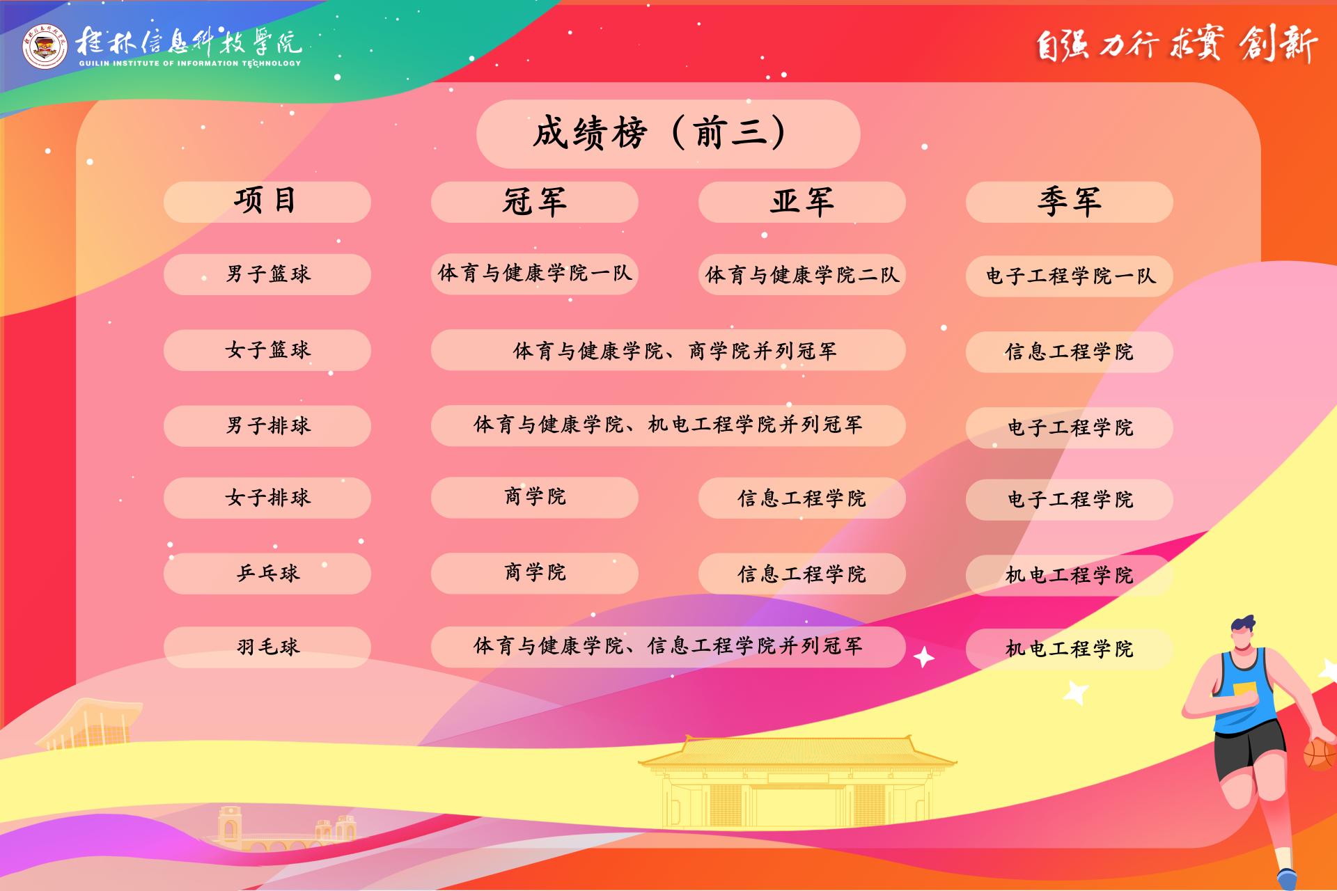 (冠军:体育与健康学院、商学院;季军:信息工程学院)