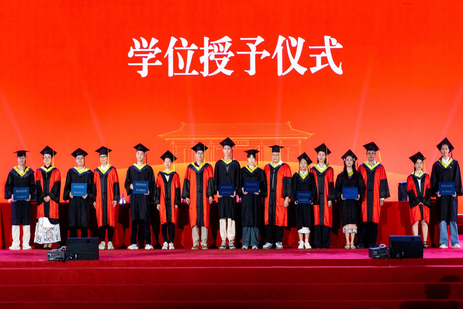 毕业典礼在庄严的国歌奏唱仪式中拉开帷幕。廖老师首先向在场师生及嘉宾隆重介绍了出席典礼的学院领导,并宣读了授予学士学位资格的决定文件。在庄重而温馨的学位授予环节,教师代表们依次为毕业生代表正冠拨穗,郑重颁发学位证书。当学位帽流苏从右前侧移向左前侧的瞬间,现场响起持久热烈的掌声,毕业生们难掩激动与不舍,或与师长深情相拥,或鞠躬致意,用最真挚的肢体语言向母校诉说感恩,向青春岁月作别。