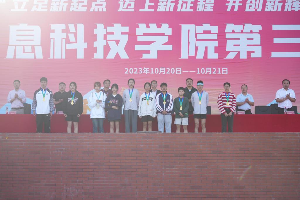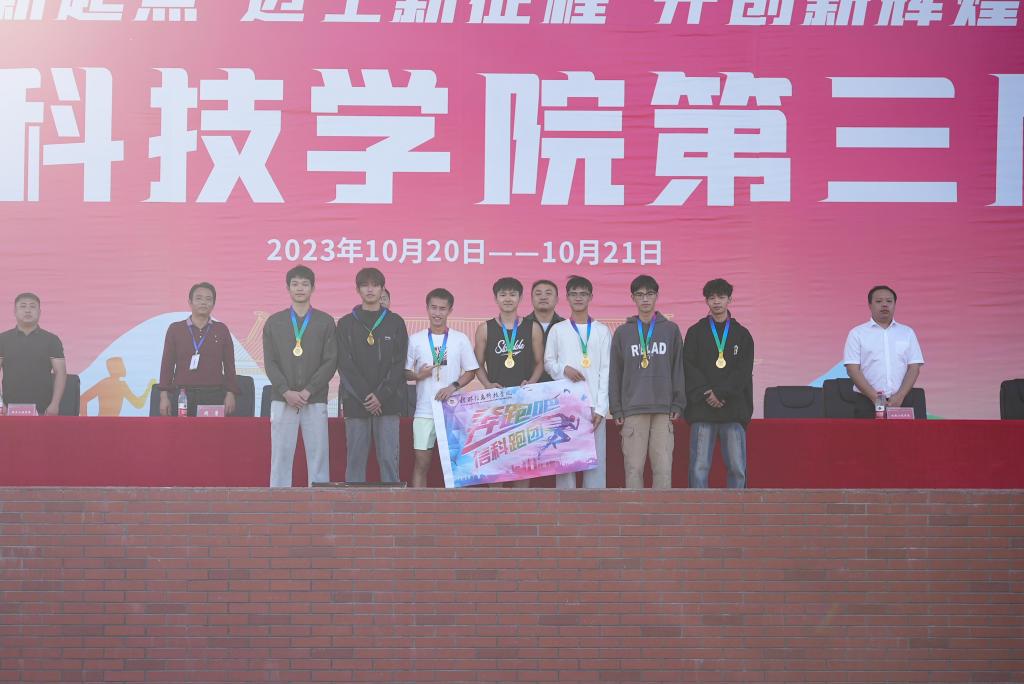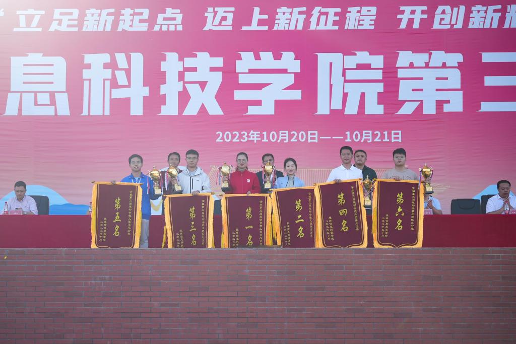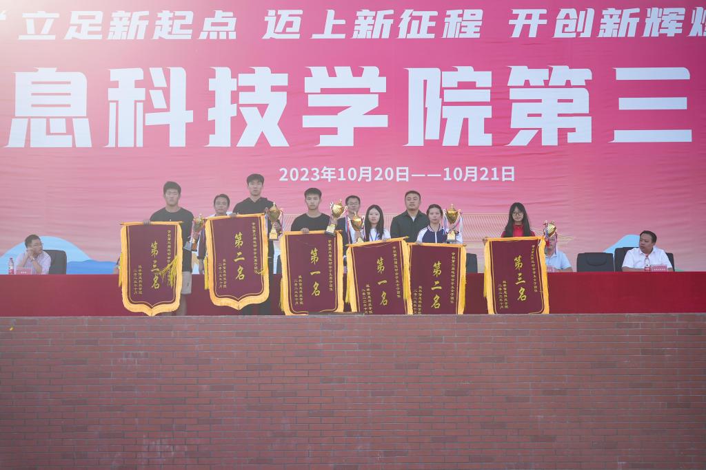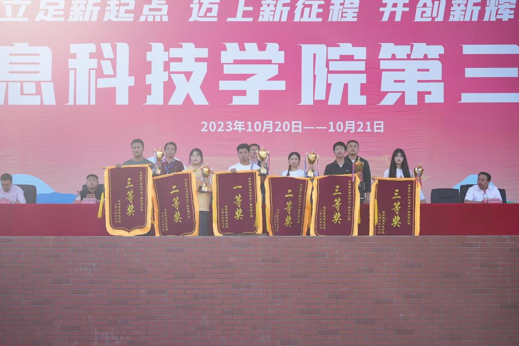 闭幕式上,学校体委副主任、运动会总裁判长周勇宣布了各项比赛成绩,主席台领导分别为获奖团队和个人进行颁奖。