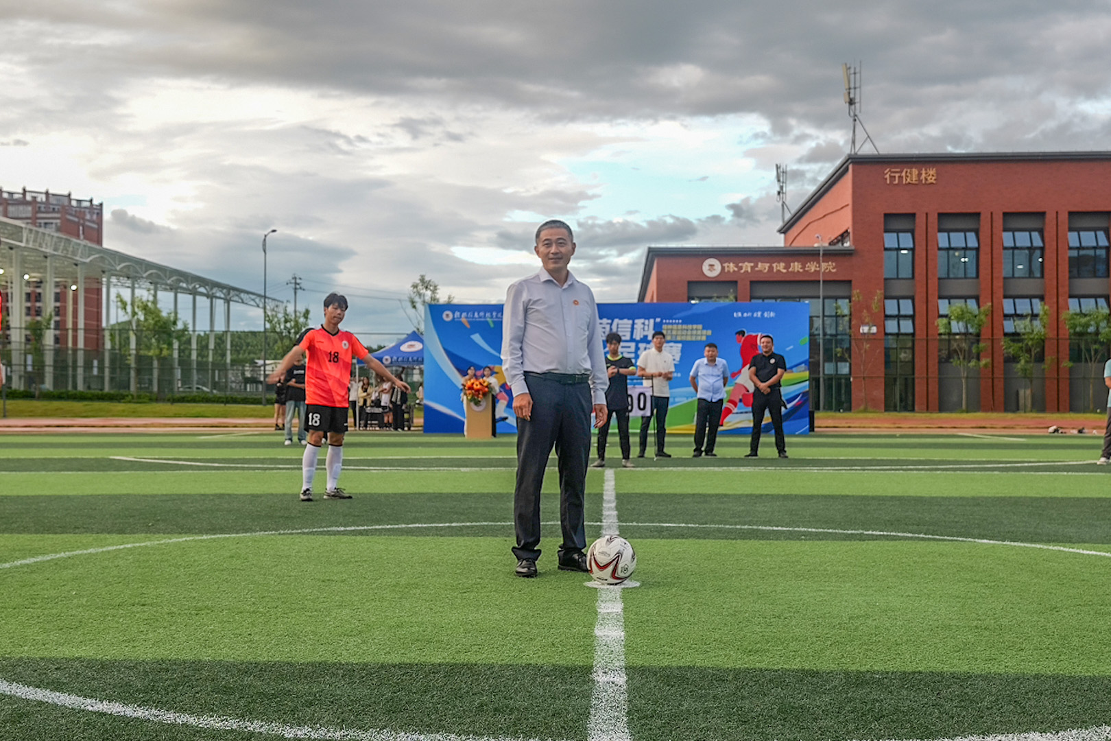 大学生艺术团舞蹈部活力四射的表演为这场足球盛宴拉开了欢乐的序幕。运动员代表翟煜博与裁判员代表黄俊分别进行庄严宣誓,他们承诺将严格遵守比赛规则,公平竞赛,发扬体育竞技精神,确保赛事顺利进行,为观众带来精彩纷呈的足球比赛。最后,学校党委副书记李飞宣布比赛正式开幕,并为教职工代表队与体育与健康学院二队带来的揭幕战开球。随着足球在空中划过一道优美的弧线,现场爆发出雷鸣般的掌声和欢呼声,将开幕式的氛围推向了最高潮。