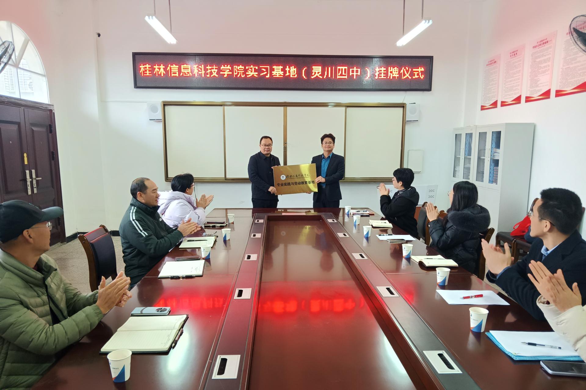 交流会上,秦校长首先对我院师生的到来表示欢迎,并对学校的教学质量、生源状况和学校管理等方面进行了详细的介绍,同时,对与我院共建实习基地,共同促进学生专业技能的提升理念予以肯定。赖安副院长也对灵川第四中学给学生提供实习机会和大力培养表示感谢,对学生取得的进步表示欣慰和由衷的高兴,并希望与灵川第四中学建立长效合作机制,加强沟通、交流,实现校校双赢。会后,双方举行“sjb世俱杯官方网站专业实践与劳动教育基地”挂牌仪式。