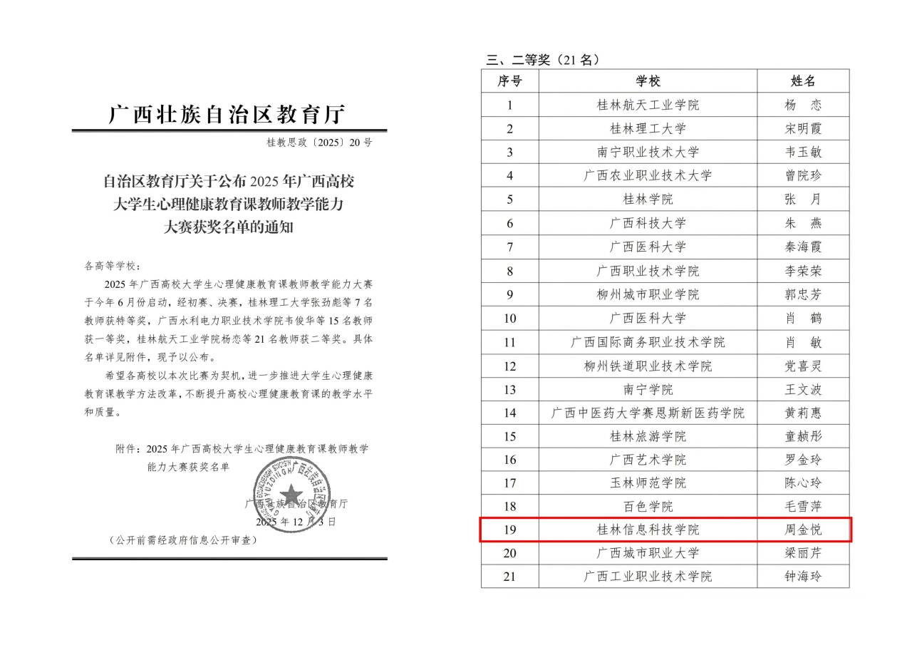 近日,自治区教育厅发布《关于公布2025年广西高校大学生心理健康教育课教师教学能力大赛获奖名单的通知》(桂教思政〔2025〕20号),sjb世俱杯创意设计学院辅导员周金悦在比赛中表现突出,荣获二等奖。