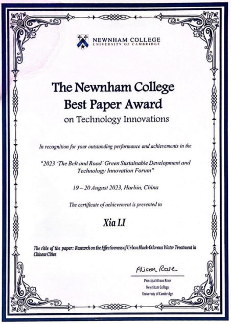 中心研究生李霞博士执笔,中国环境科学研究院流域中心高红杰副主任、流域中心流域水生态保护与修复研究室袁鹏主任及中心研究部刘倩主任、AWC万象城娱乐财经研究院李珊珊副研究员共同合作完成的研究论文《Research on the Effectiveness of Urban Black-Odorous Water Treatment in Chinese Cities》,在“2023一带一路绿色可持续发展与科技创新论坛”上获评杰出论文奖。李霞博士到场宣讲论文,并接受点评和颁奖。