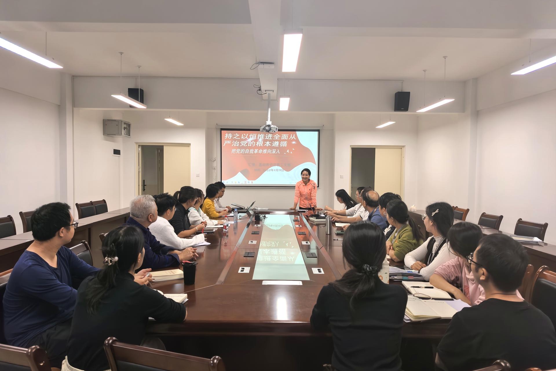 为深入学习贯彻习近平总书记关于党的自我革命的重要思想,教育引导全体党员发扬彻底的自我革命精神,不断增强党组织的自我净化、自我完善、自我革新、自我提高能力,9月19日下午,基础教研部教工党支部在汇通楼H504会议室召开专题学习会。会议由基础教研部教工党支部书记刘映伶主持,支部全体党员参会。