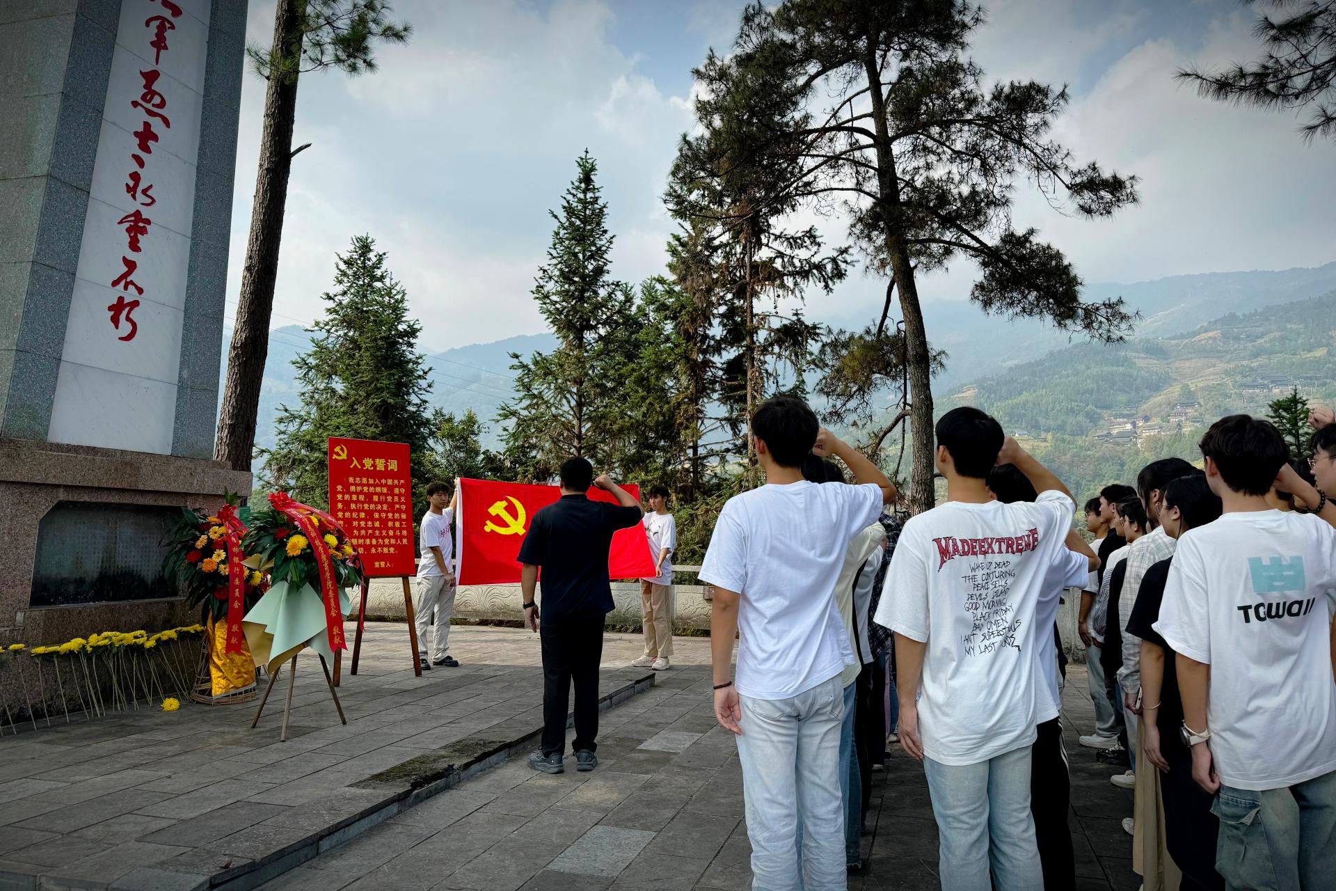 活动当天,党员师生首先前往了“万人界”长征体验区,这里是中国工农红军长征途中的重要一站,承载着深厚的红色记忆与革命精神。党员师生参观了长征驿站、红色讲堂等场所,通过听取讲解员的沙盘讲解和观看珍贵的历史图片、文物,深入了解红军长征的艰辛历程和伟大精神。随后,师生们沿着“万人界”山路攀登而上,亲身感受红军战士在长征途中所经历的艰难险阻。万人界共1450级台阶,约1华里的山路,是红军长征的1/25000,是中国工农红军举世无双伟大壮举的一个缩影。在攀登过程中,大家不时驻足沉思,深刻体会红军战士的英勇无畏和坚韧不拔。到达山顶后,师生们集体参观了湘江战役红军烈士墓葬保护点,向无名红军烈士墓敬献了花篮,并默哀致敬。在烈士墓前,第三学生党支部书记王永杰带领所有党员同志重温入党誓词,再一次接受心灵的洗礼。最后,党员师生前往龙胜红军岩长征国家文化公园,重温了红军当年“一字获民心”的感人故事,切身感受了革命先烈崇高的理想信念和不屈不挠的革命精神。