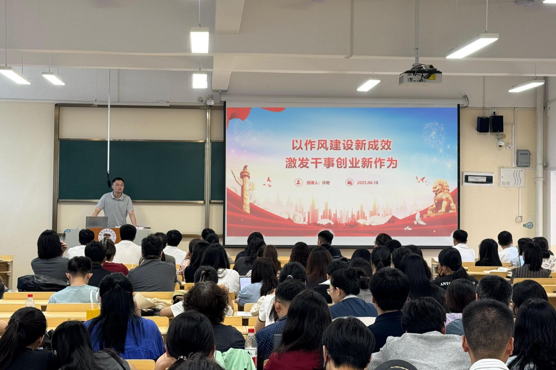 为扎实开展深入贯彻中央八项规定精神学习教育,切实筑牢作风建设根基,6月18日,商学院党委书记许奇以《以作风建设新成效激发干事创业新作为》为题讲授学习教育专题党课,学院全体教工党员参会。