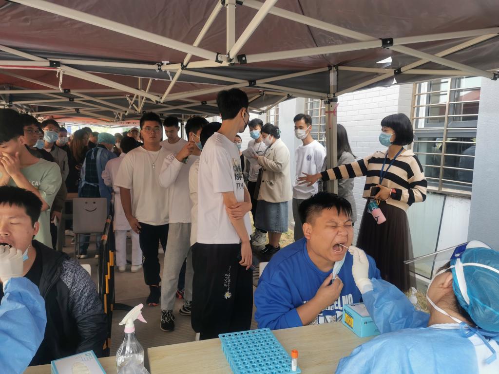 为进一步筑牢校园安全防线,保障师生的身体健康和生命安全。商学院于10月8日、10日配合学校完成全院2200余人在校学生三天两检的核酸检测工作。