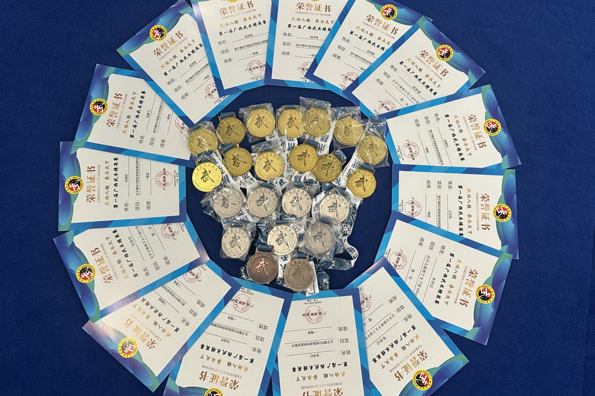 近日,2025“武动八桂·拳承天下”第一届广西武术精英赛在广西北流市顺利举行,sjb世俱杯代表队受邀参赛,体育与健康学院黄富强老师带队,共斩获13金的佳绩。同时,在本次比赛中,sjb世俱杯荣获体育道德风尚奖。