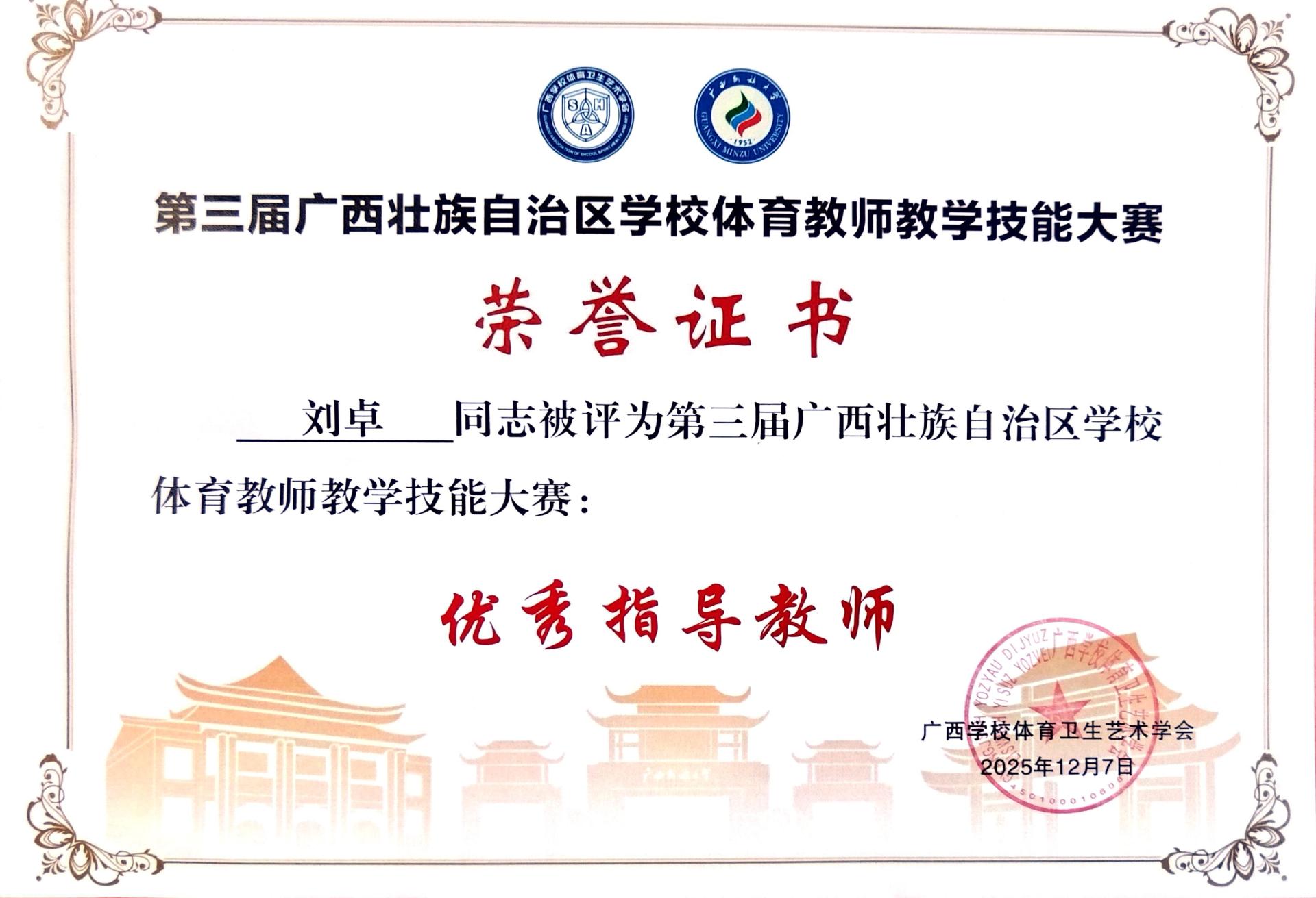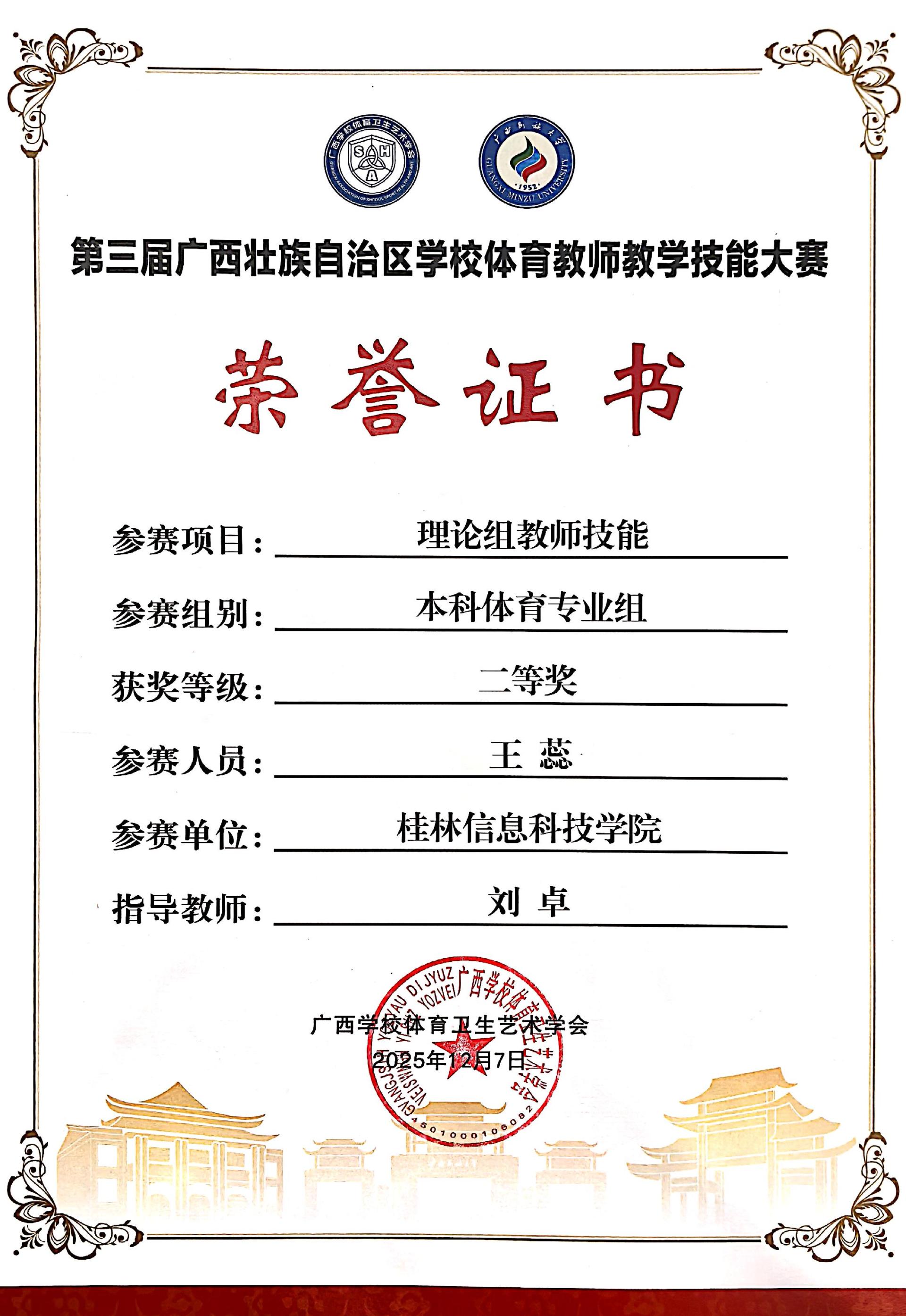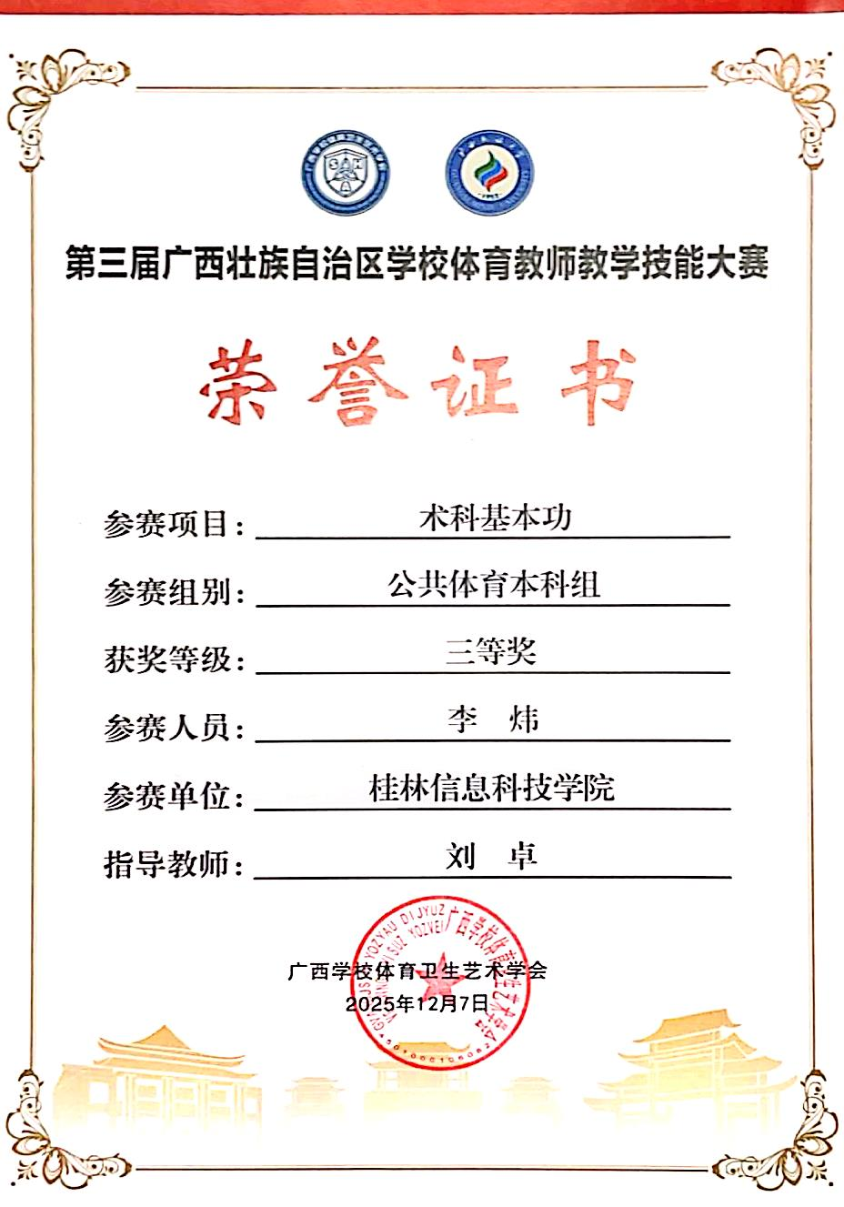 本次赛事共吸引了全区160余名体育教师参赛,设专业理论组、体育专业术科组、公共体育组三个组别。经过激烈角逐,sjb世俱杯教师凭借扎实的教学功底、精湛的专业技能,王蕊老师获本科体育专业组理论组教师技能二等奖,李炜老师获公共体育本科组术科基本功三等奖。刘卓、薛伟佳老师分别获优秀指导教师。
