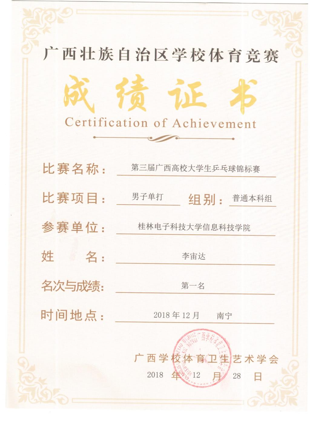 2018第三届广西高校大学生乒乓球锦标赛男子单打第1名