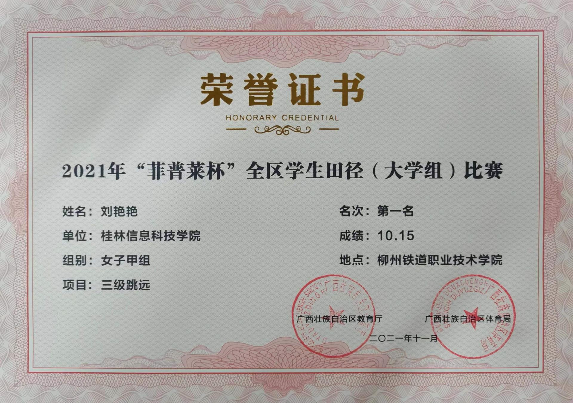 2021年“菲普莱杯”全区学生田径(大学组)女子甲组三级跳远第一名