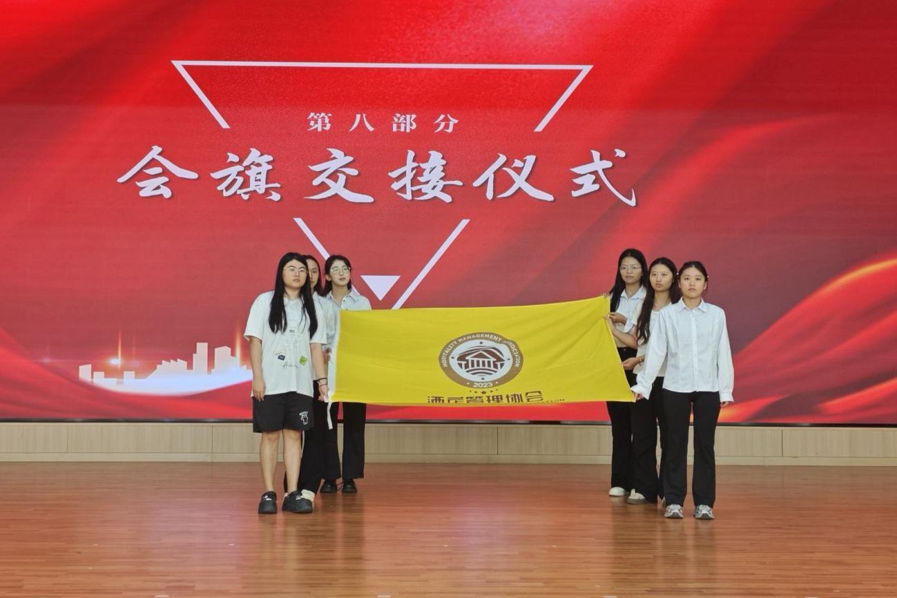 接着,象征协会精神传承的重要时刻——会旗交接仪式。在全体老师与同学的见证下,第二届主席团代表成员郑重地将协会会旗交至新任主席团代表成员的手中。这一庄重的交接,不仅传递了责任与使命,更寓意着协会的传承和延续。最后,酒店管理协会指导老师冯文雄老师上台致辞,对上一届协会在组织建设、活动开展等方面取得的成绩给予了充分的肯定,并对新一届成员提出了殷切的期望。在热烈的掌声中,酒店管理协会第三届换届大会圆满落幕。新老成员合影留念,共同祝愿酒店管理协会在新一届骨干的带领下再创佳绩!