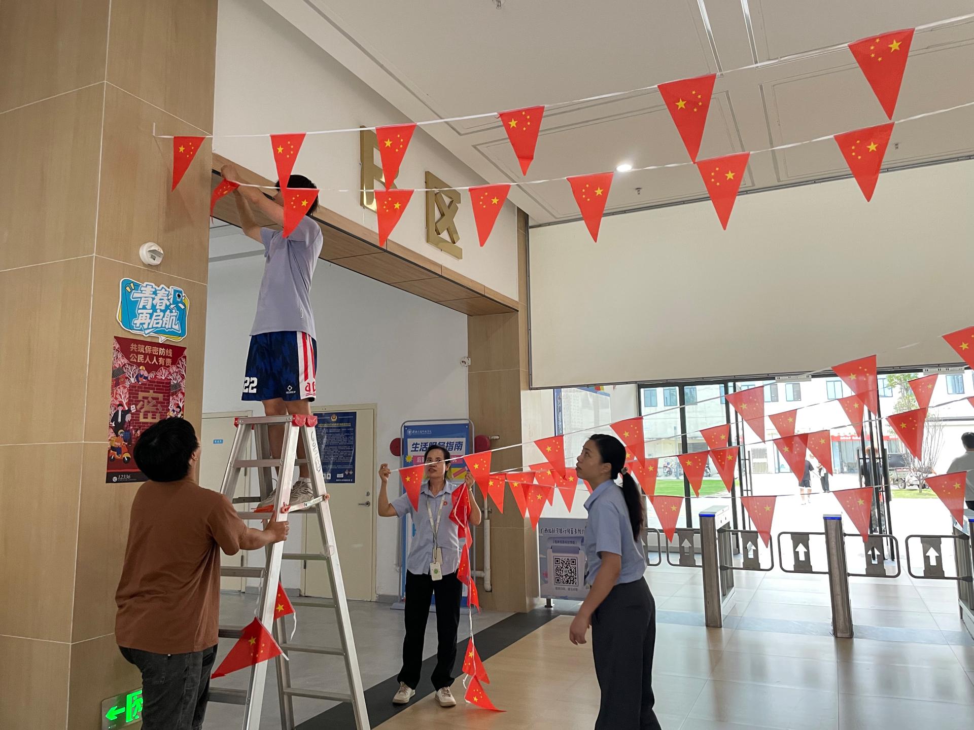 为了营造节日氛围,增强学生在公寓生活的幸福感和参与感,公寓中心的生活老师邀请同学们一起布置公寓大厅。同学们出谋划策,共同为公寓添加“家”氛围,这也体现了后勤服务充分发挥学生的“自我服务”“自我管理”的育人功能。同时,公寓的生活老师和同学们一起拍摄了“我和我的祖国”节日短视频,有效增强了师生互动,增进师生情谊,一起表达对伟大祖国的祝福,弘扬爱国精神,也体现了后勤人的家国情怀。此外,公寓的生活老师在给同学们表达节日祝福的同时也通过视频的方式叮嘱学生假期注意安全,体现了生活老师对学生“儿行千里母担忧”的关怀。视频在公寓宣传电子屏上播放,引发广大学生共鸣,把安全教育浸润到学生日常生活中。