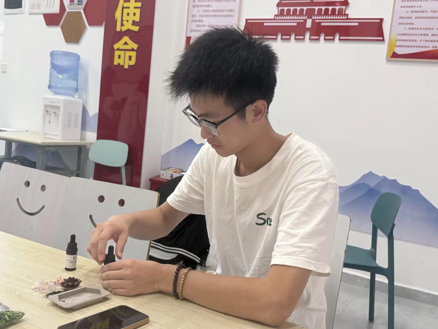 在实操环节,同学们领取蜡材、香料、模具及装饰材料,充分发挥自己的创意。有的同学用桂花精油搭配干桂花复刻庭院芬芳,也有同学以雪松精油结合墨绿色蜡材营造山林静谧感,现场氛围温馨且欢乐。
