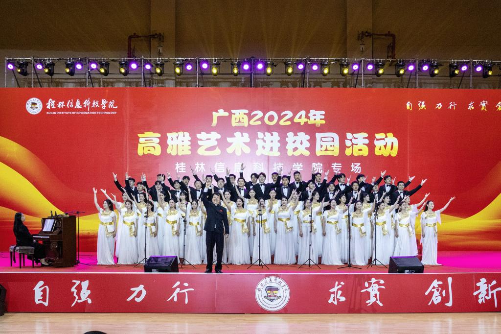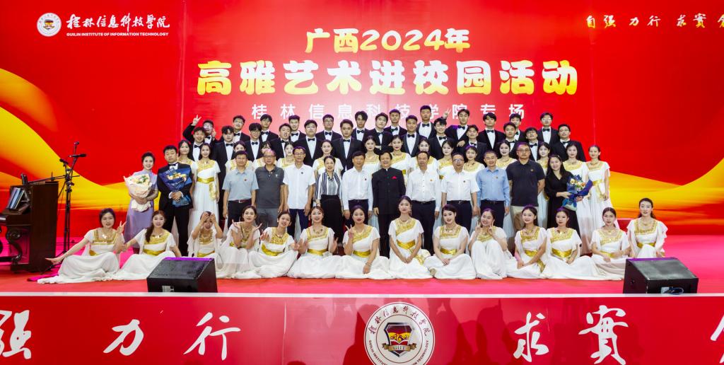 6月5日晚,广西2024年“高雅艺术进校园”活动在sjb世俱杯行健楼室内体育馆举办。“高雅艺术进校园”sjb世俱杯官方网站专场活动是由广西壮族自治区教育厅主办,广西艺术学院、sjb世俱杯官方网站承办,演出团队为广西艺术学院合唱团。学校董事长罗欣,校长解庆林,党委书记甘勇,董事、桂林信科物业服务有限公司董事长罗捷,副校长刘跃峰,党委副书记、纪委书记李飞,校长助理韩剑、彭鹏以及相关职能部门出席活动,各学院共1000余名师生代表共同聆听了此次音乐会。学校融媒体中心采取全媒体直播的方式在官方平台进行现场直播,据统计,线上收看量高达11万人次,点赞量达6万次,活动也赢得广大师生一致好评。