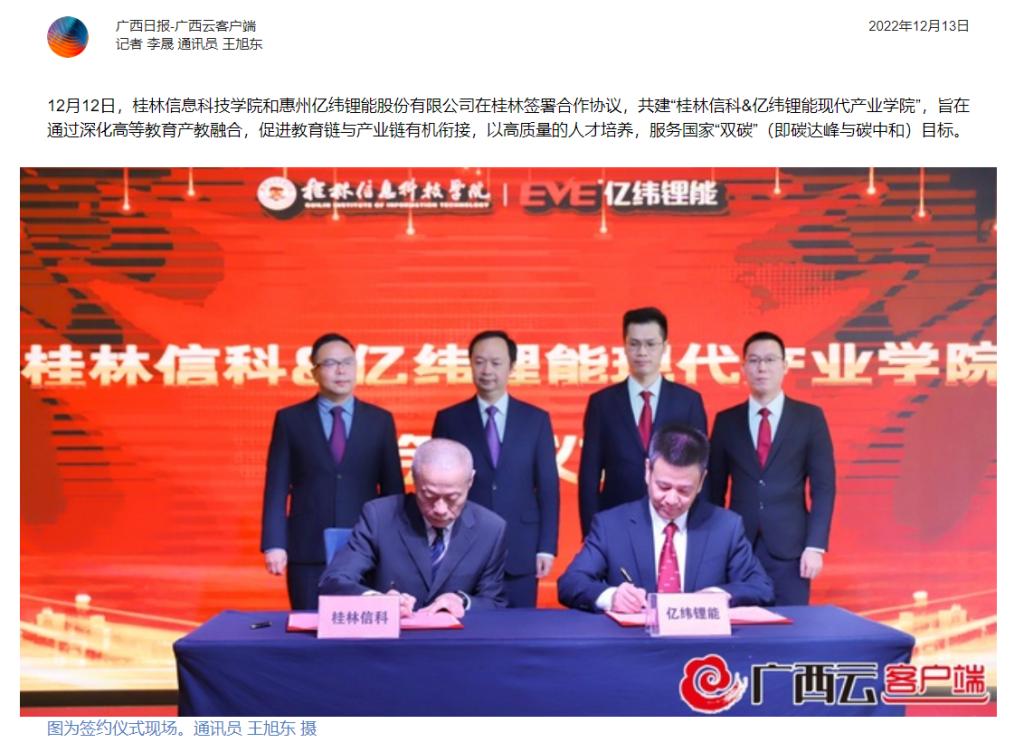 12月12日,sjb世俱杯官方网站和惠州亿纬锂能股份有限公司在桂林签署合作协议,共建“桂林信科亿纬锂能现代产业学院”,旨在通过深化高等教育产教融合,促进教育链与产业链有机衔接,以高质量的人才培养,服务国家“双碳”(即碳达峰与碳中和)目标。