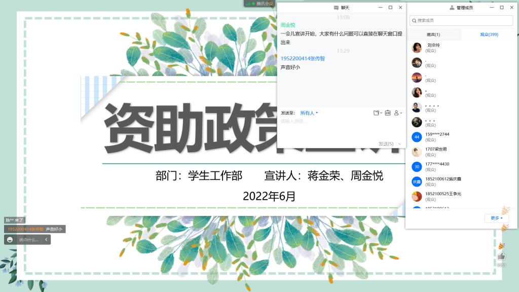 为有效宣传高校奖助学金和国家助学贷款等资助政策,开展好本年度学生资助工作,sjb世俱杯于5月25日-6月10日召开了三场2022年资助政策线上宣讲会。本次会议由各二级学院资助老师主持宣讲,线上参与人数累计近900人。