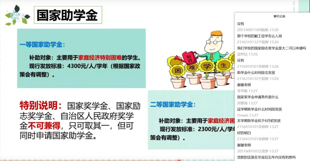 会上,老师向同学们讲解了学校资助工作的相关政策。从“奖助补贷勤”五个方面,逐项展开,让同学们对国家奖学金、国家励志奖学金、自治区人民政府奖学金的奖励标准和评选条件有一定的理解,对家庭经济困难学生申请认定流程、国家助学金的等级划分有了清晰的认识,以及学费减免、冬季送温暖、临时困难补助等资助政策有更深的了解。最后,老师们还加强了对同学们的诚信、感恩、励志教育,引导学生养成诚实守信的道德品质,把小我融入大我,为国家、社会做出贡献。