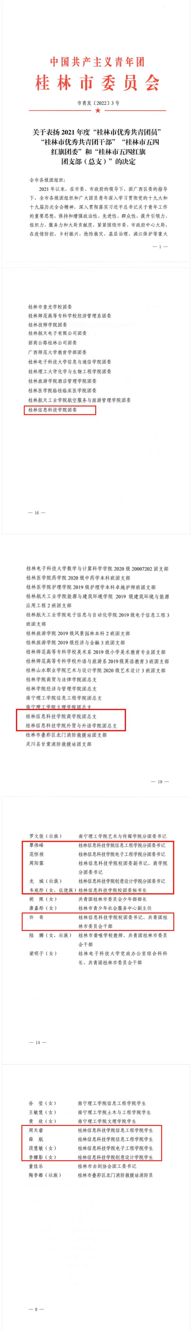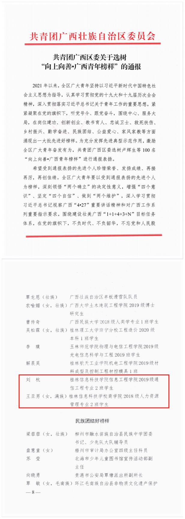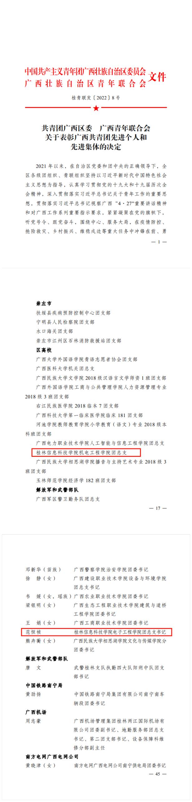 2022年是中国共青团成立100周年。近日,共青团广西区委、共青团桂林市委相继印发了《共青团广西区委 广西青年联合会关于表彰广西共青团先进个人和先进集体的决定》、《共青团广西区委办公室关于选树“向上向善•广西青年榜样”工作的通知》、《关于表扬2021年度“桂林市优秀共青团员”“桂林市优秀共青团干部”“桂林市五四红旗团委”和“桂林市五四红旗团支部(总支)”的决定》,sjb世俱杯共计4个集体、13名个人光荣上榜,获奖项目丰硕、获奖数量再创新高。