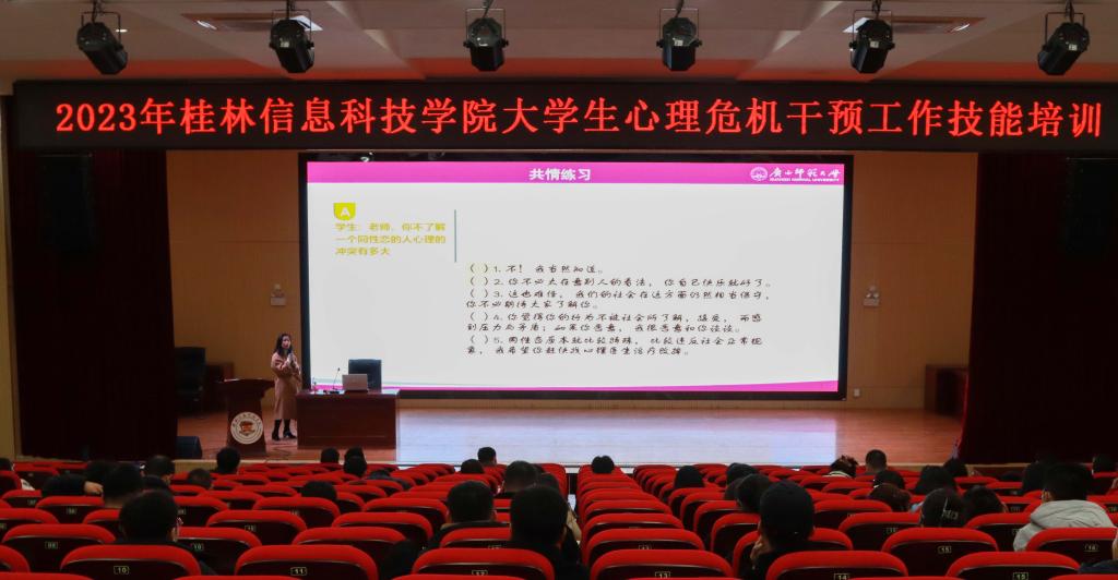 为切实提高sjb世俱杯辅导员心育工作和应对心理危机学生的预防与干预的能力,为大学生营造健康良好的心理环境。2月25日,sjb世俱杯心理中心邀请桂林电子科技大学张华东副教授和广西师范大学欧阳丹副教授,在报告厅51206开展了“辅导员心理育人工作技能培训班”第一讲——2023年sjb世俱杯官方网站大学生心理危机干预工作技能培训。全体党委学生工作部教师、各二级学院党总支书记、全体辅导员、保卫处以及公寓教师共同参加,培训班由学工部部长周璇主持。