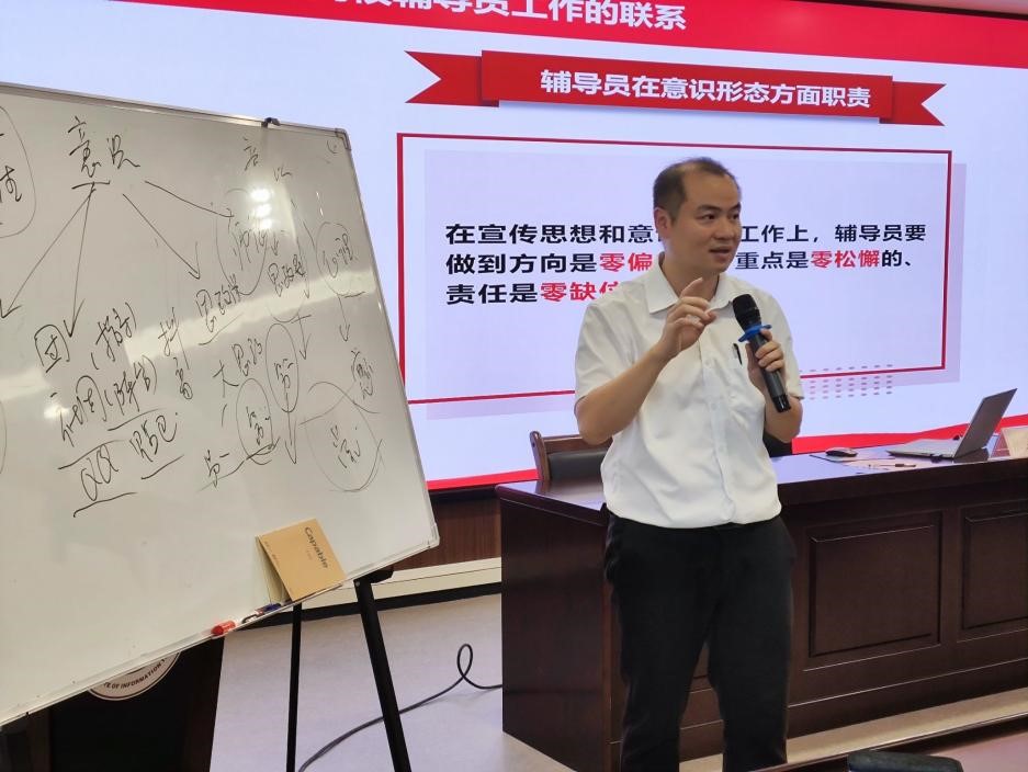 在为期5天的培训中,围绕辅导员的使命担当、突发事件的处置等内容设置了九个专题的学习。党委学生工作部部长周璇就《新时代高校辅导员职业能力及其在班级管理中的运用》进行了主题讲座,他号召全体学员要深刻认识新时代高校辅导员的角色定位和使命担当,努力提升自身职业能力,以更好的服务学生成长成才和学校事业发展做出贡献。