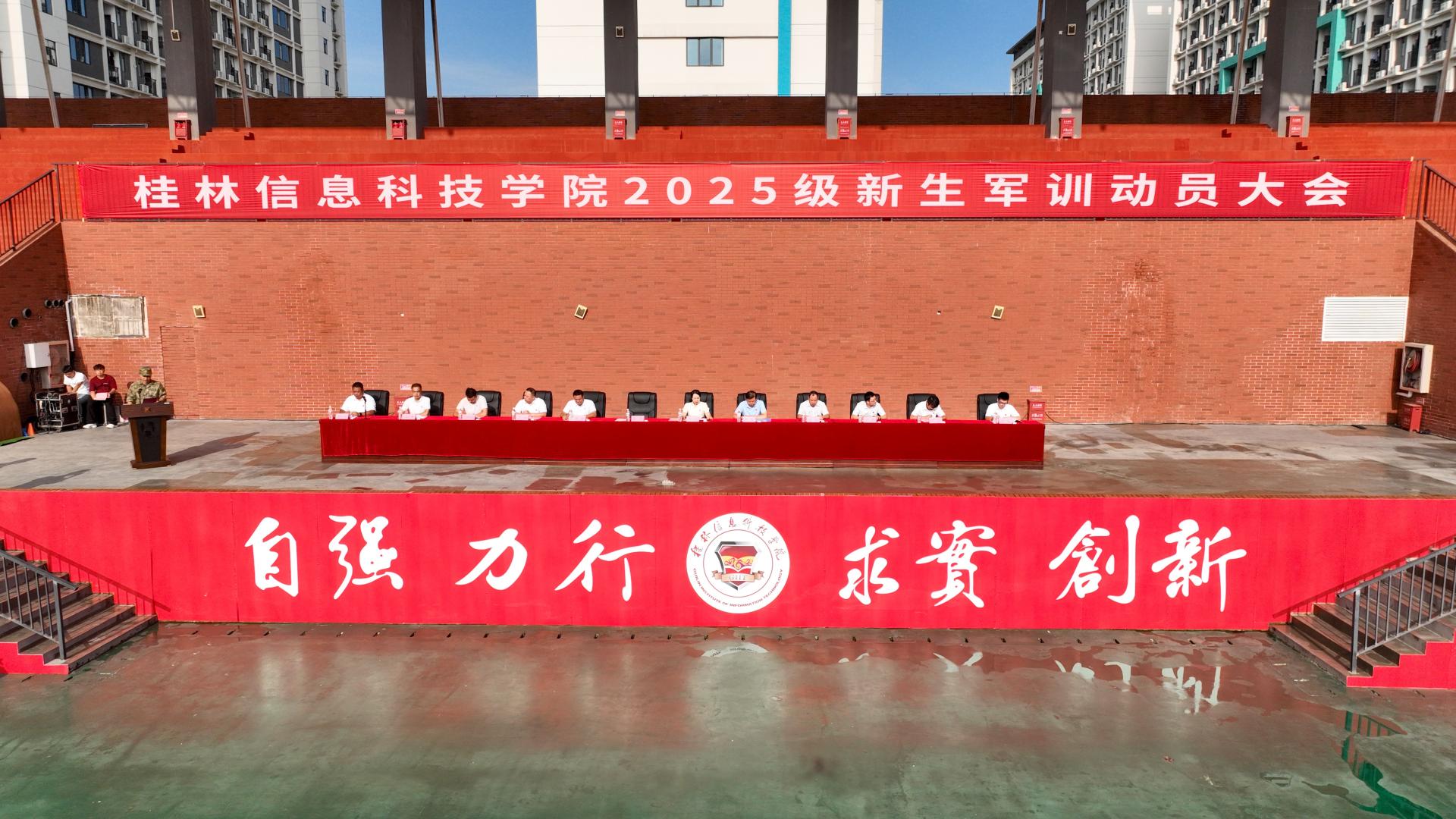 8月30日上午,学校在田径场召开2025级新生军训动员大会,中国人民解放军临桂区人民武装部政委苏瑜上校,学校副校长罗捷、校长助理周璇、学生发展与服务中心副主任蒋勇以及各学院党委、党总支书记出席大会。承训部队全体教官、新生辅导员以及全体新生参加大会,大会由学校武装部副部长罗光铭主持。