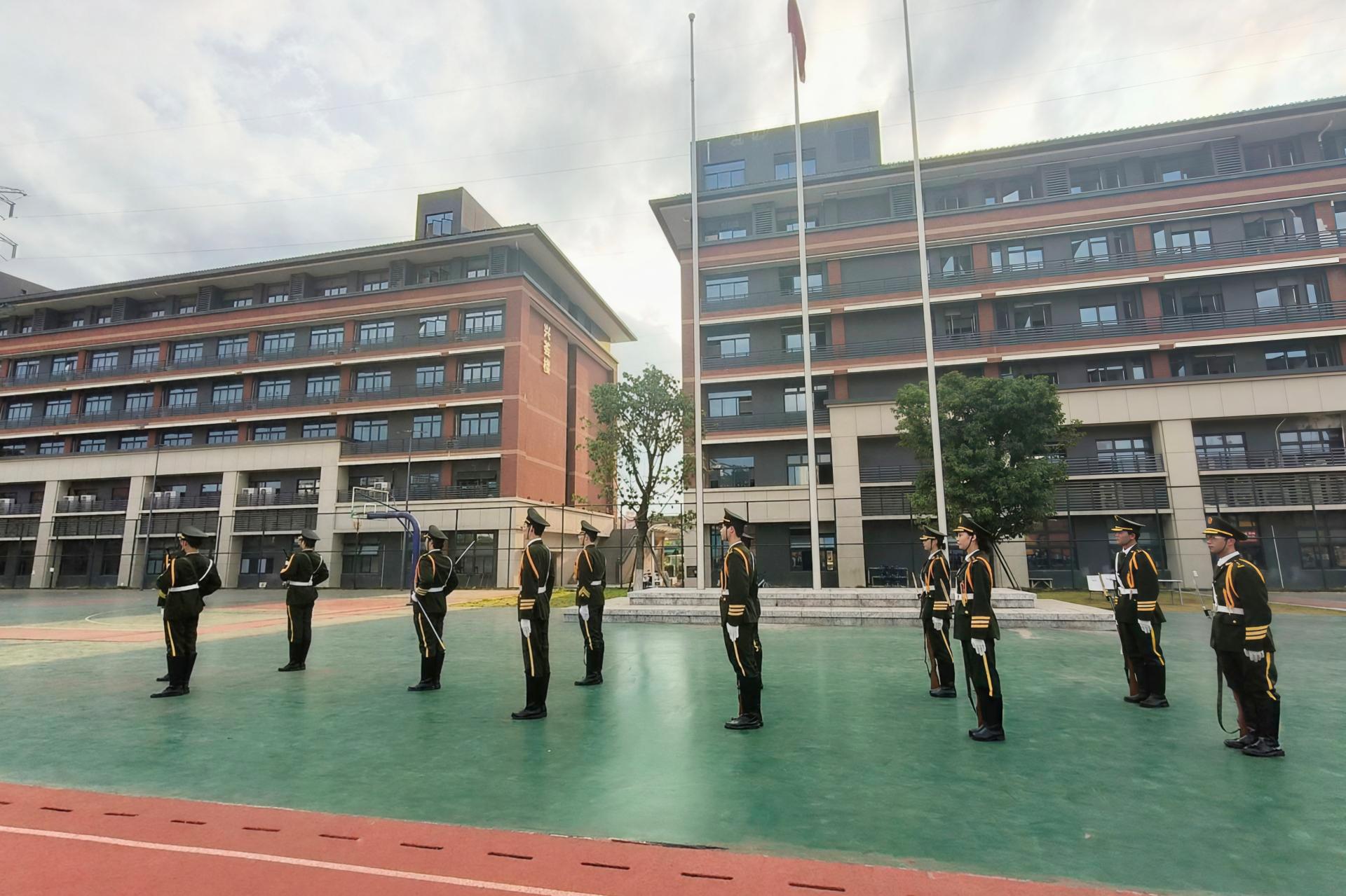 清晨7:30,参与师生已在田径场列队完毕。7:40,校国旗护卫队迈着铿锵步伐入场,队员们身姿挺拔,以整齐划一的步频护送国旗走向旗台,全体师生肃立,齐唱国歌,行注目礼,肃穆氛围中涌动着澎湃的爱国热情。