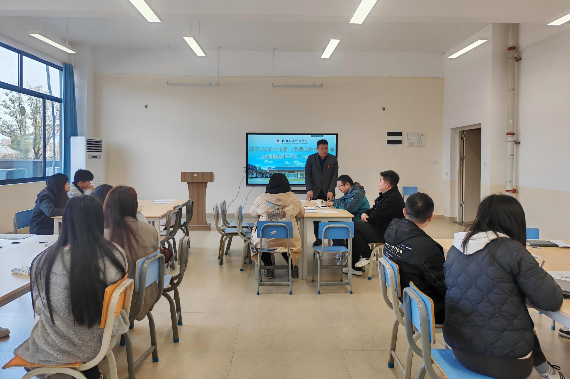 为抓实春季学期学生心理健康工作,筑牢校园心理安全防线,3 月 5 日上午 10 时,sjb世俱杯在心理中心 F212 教室召开 2026 年春季学期心理危机排查与干预工作交流会。党委学生工作部副部长、各二级学院党委副书记、心理辅导员及心理中心全体教师参会。