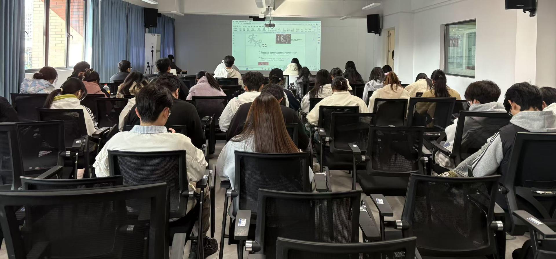 分享会伊始,主讲人以“汉服不是古装,是活着的文化”为切入点,打破大家对汉服的认知误区。通过生动讲解,详细拆解了平面剪裁、交领右衽、系带隐扣等汉服核心特征,用“衣襟右掩藏礼序,系带无扣蕴包容”的通俗表述,让零基础学子快速掌握关键知识点。在“汉服简史”环节,主讲人沿着历史脉络,逐一介绍先秦玄端的庄重典雅、魏晋襦裙的飘逸灵动、盛唐圆领袍的豪迈大气、宋代褙子的清雅简约及明代袄裙马面的精巧繁复,搭配实物展示、高清图片、视频解说,直观呈现汉服形制随时代变迁的审美演进。