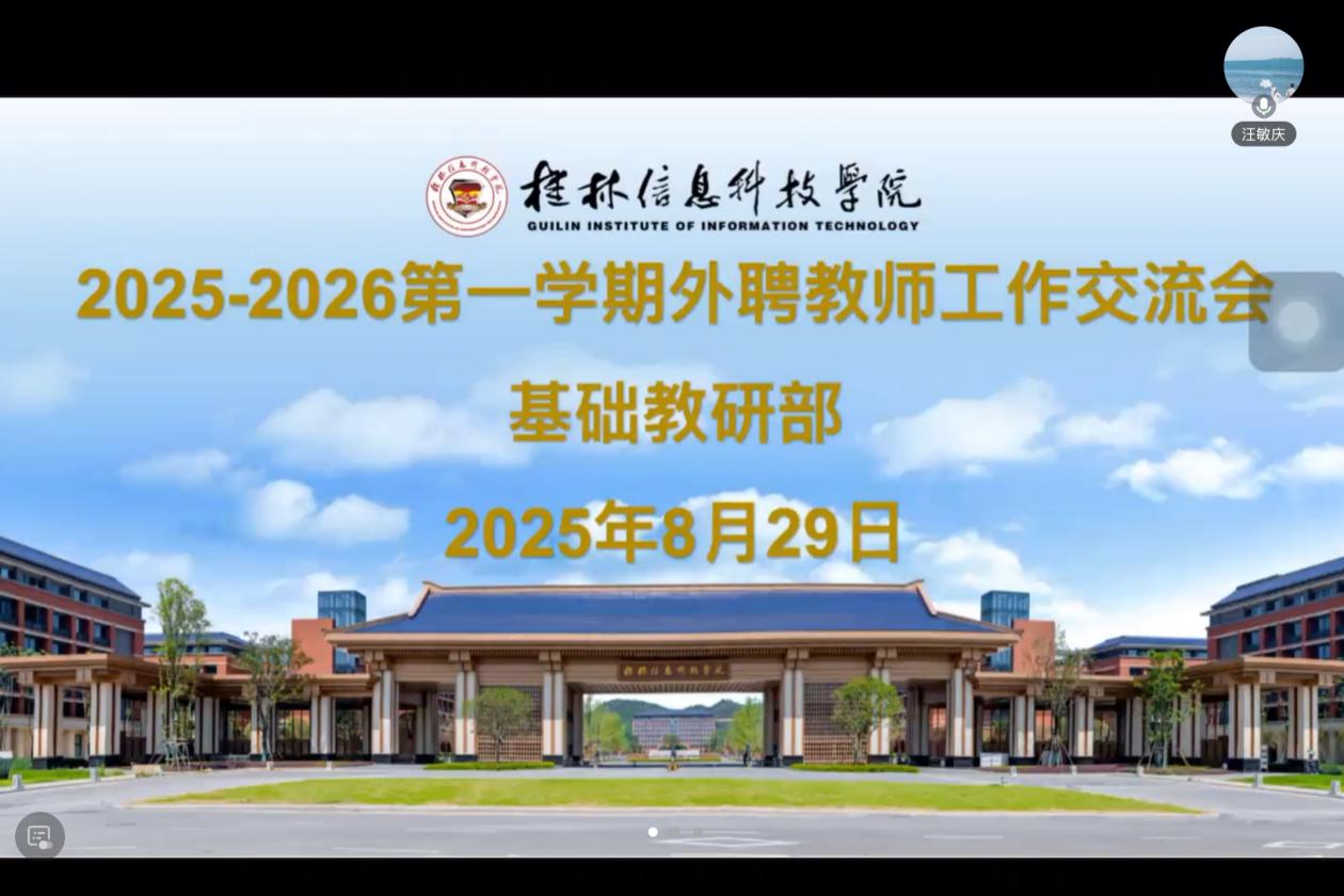 基础教研部召开2025年秋季学期外聘教师工作线上交流会为进一步规范教学管理,加强外聘教师队伍建设,确保新学期各项教学工作有序开展,基础教研部于8月29日召开2025年秋季学期外聘教师工作线上交流会。本次会议由基础教研部主任助理汪敏庆主持,教研室主任及全体外聘...