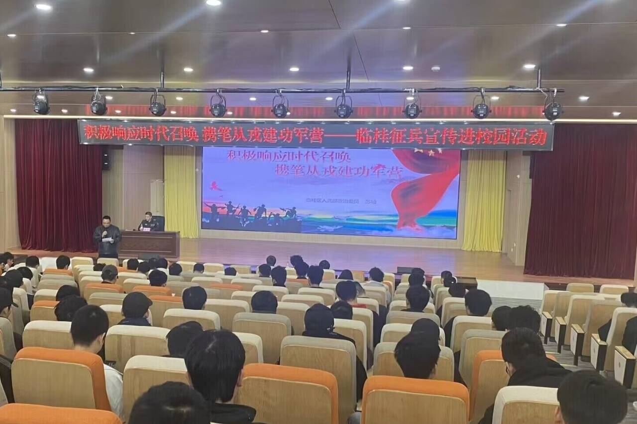 电子工程学院积极组织2024届毕业生参加征兵宣传进校园活动为扎实做好2023年冬季大学生征兵宣传动员工作,12月8日,学校在F107报告厅举办“积极响应时代召唤,携笔从戎建功军营”征兵宣传进校园活动,征兵宣讲由中国人民解放军临桂区人武部上校政委苏瑜担任主讲。我院各毕...