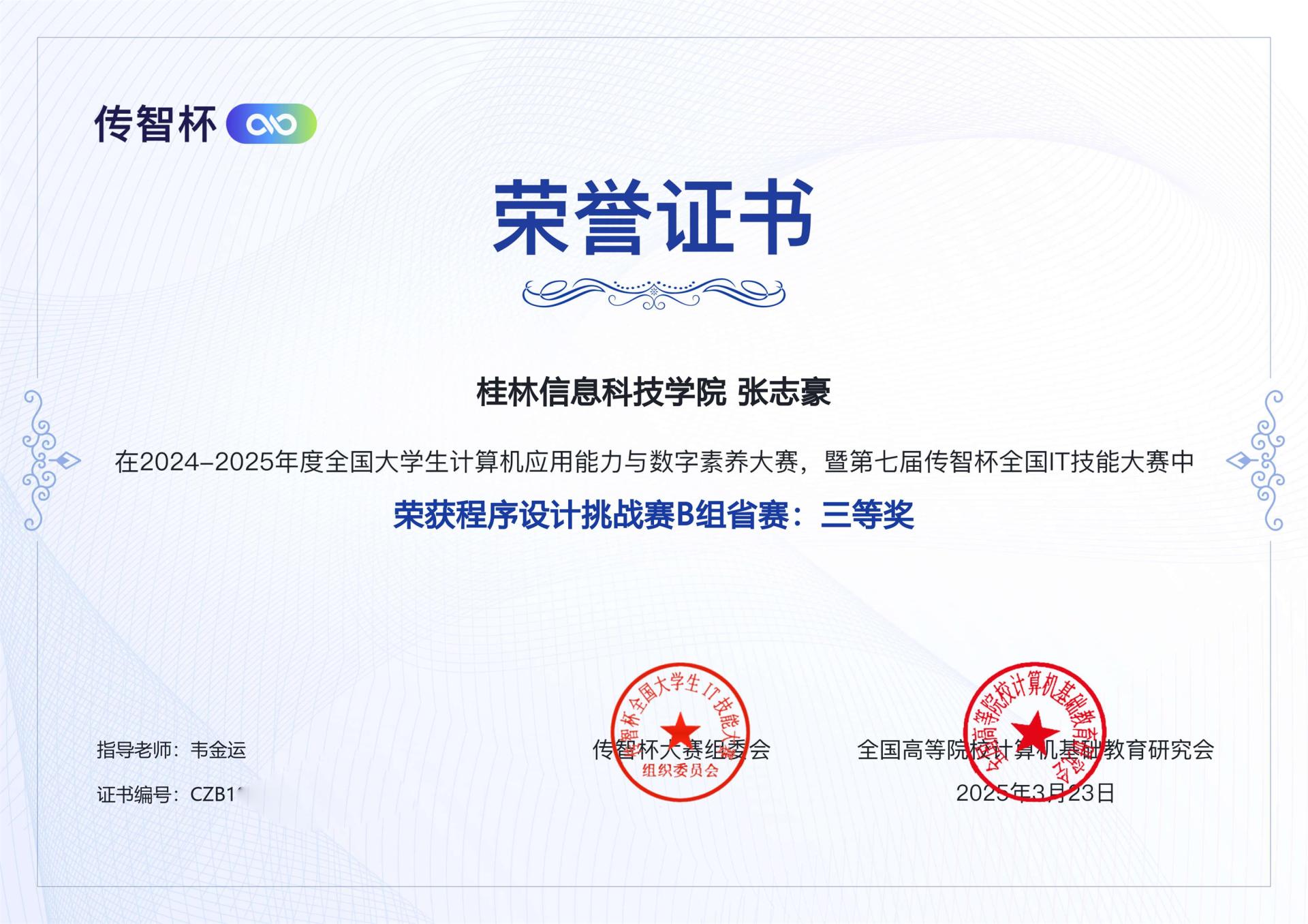 近日,第七届“传智杯”全国大学生IT技能大赛程序设计挑战赛国赛落下帷幕。信息工程学院学子,同时也是ACM算法与竞赛协会的成员,他们不负众望,凭借扎实的算法能力,首次参赛便获得了国赛二等奖1项,国赛三等奖1项的亮眼成绩,为校争光,也为ACM算法与竞赛协会争得了更多的荣誉。