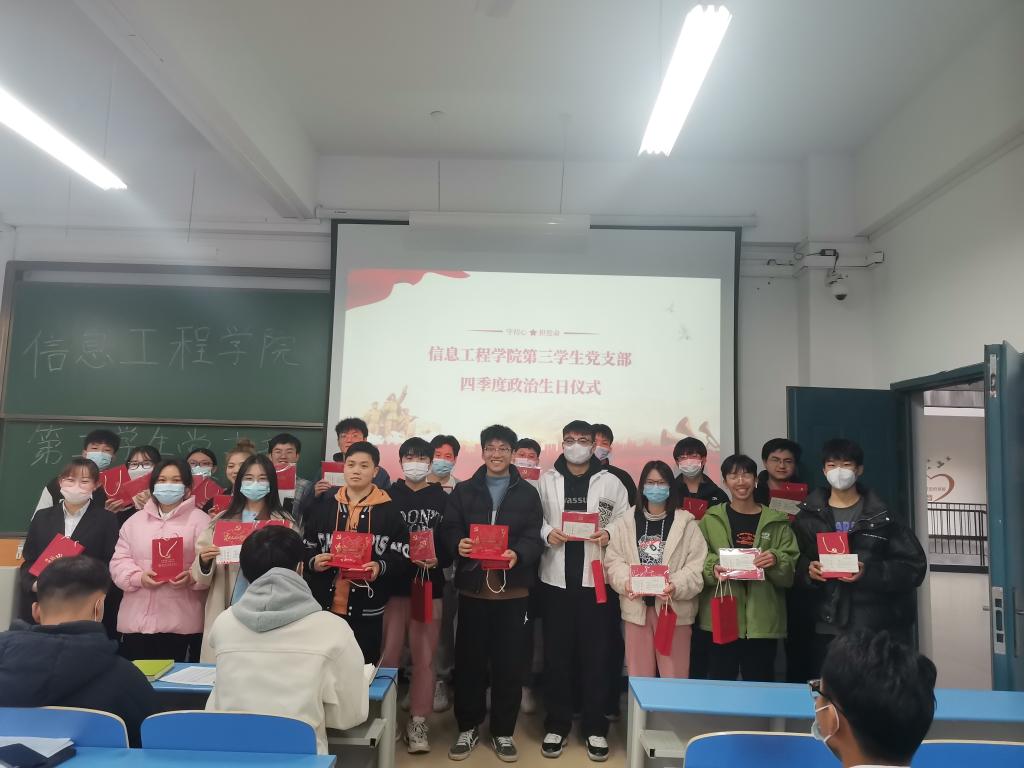 为传递党组织的关心、希望和鞭策,提醒激励党员不忘初心、牢记使命、奋发作为。12月12日,信息工程学院第一、第二、第三学生党支分别组织开展“政治生日”主题党日活动。活动由各学生党支部书记组织,支部全体师生参加。