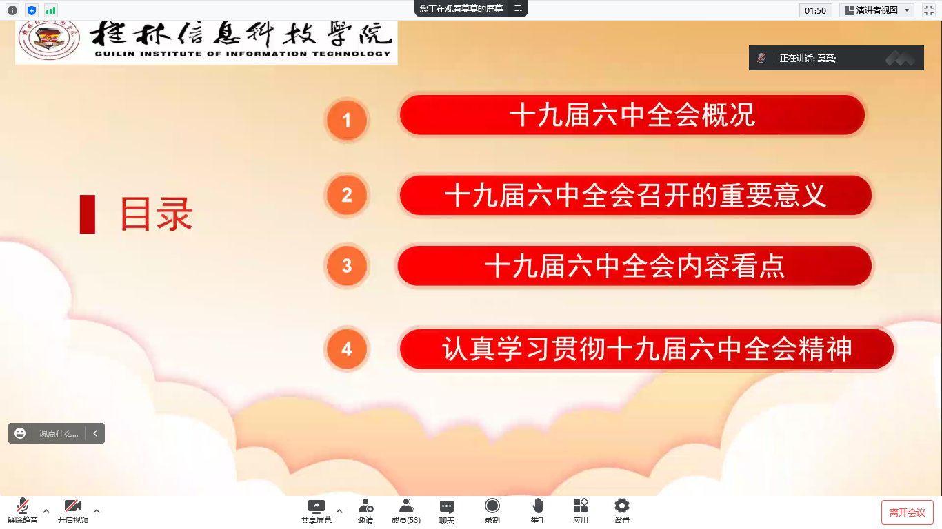 会上,莫丽梅老师从“十九届六中全会概况”“十九届六中全会召开的重要意义”“十九届六中全会内容看点”“认真学习贯彻十九届六中全会精神”四个方面,用翔实的数据、鲜活的事例对全会的精神作了深入阐述和系统的讲解。