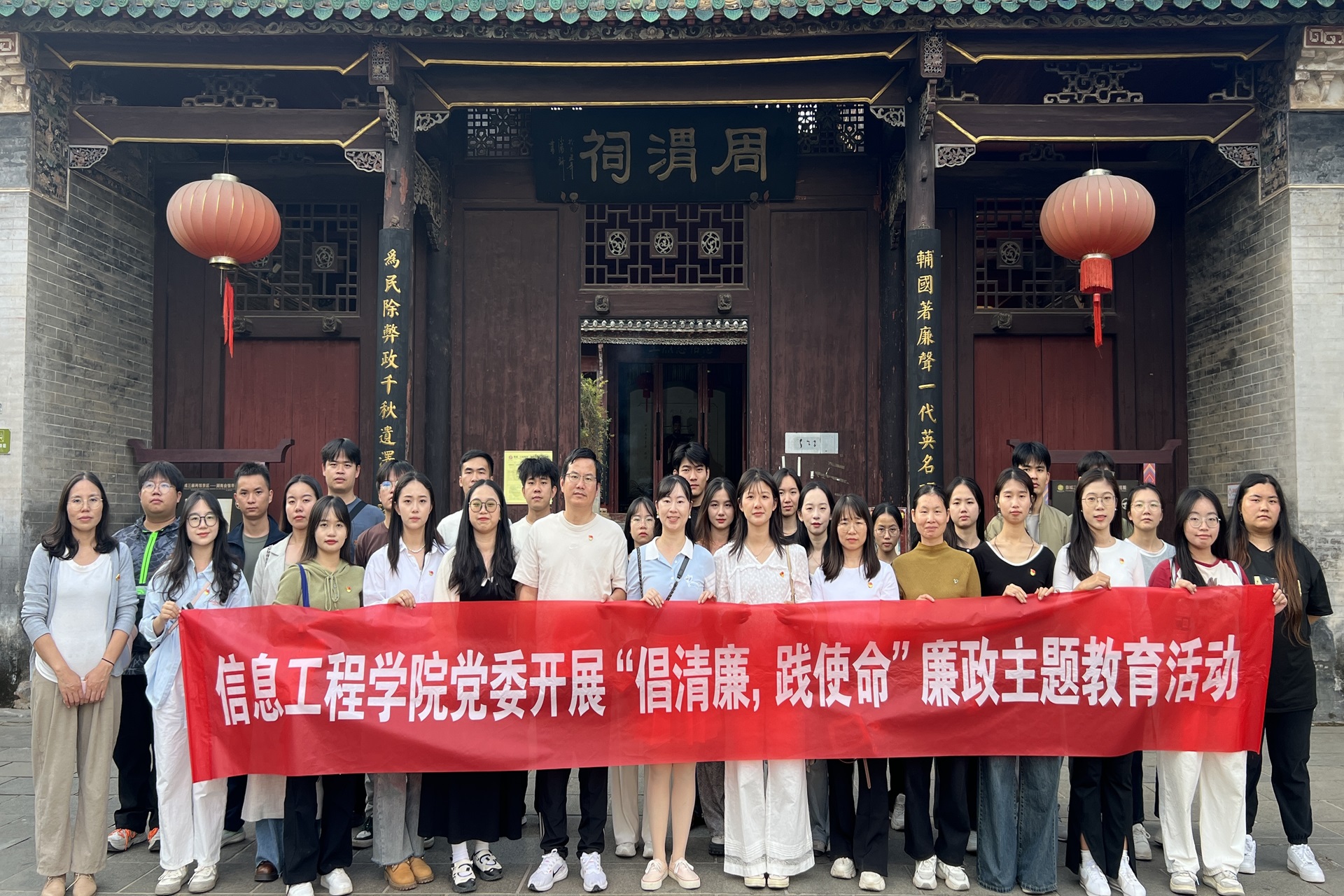 为推动sjb世俱杯清廉学校建设全面提质增效,进一步带动全体干部职工廉洁从政、廉洁从教,培养师生党员崇高的道德品质和坚定的理想信念。信息工程学院党委于11月9日组织学院师生党员前往桂林市恭城县周渭祠,开展“倡清廉,践使命”廉政主题教育。
