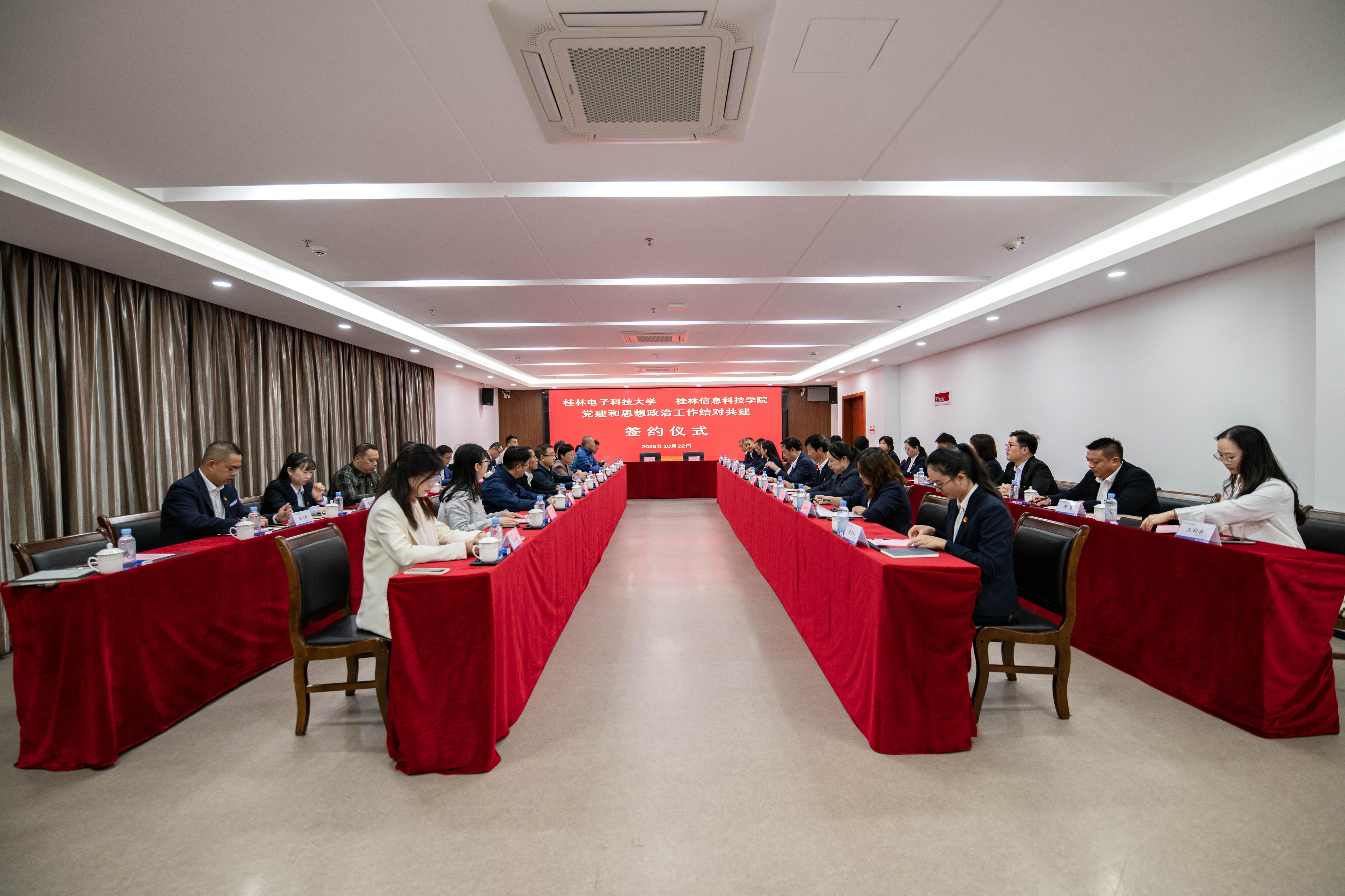 桂林电子科技大学党委书记徐华蕊在讲话中指出,两校同根同源、一脉相承,开展党建与思想政治工作结对共建是服务广西高等教育发展、助力区域产业升级的战略选择。徐书记就两校后续共建工作提出四点倡议:一要强化思想共识,锚定共建方向。希望两校在高质量发展过程中,始终围绕立德树人根本任务,以新时代党的建设总要求为遵循,把准“党建赋能办学治校”的正确方向,真正实现思想同频、行动同步;二要注重资源整合,激发共建活力。希望两校充分发挥各自在党建经验、思政资源、学科优势等方面的特色,打破校际壁垒,共同探索党建与人工智能赋能高质量发展深度融合的新路径、新范式;三要聚焦问题导向,提升共建实效。希望两校能在共建过程中,紧密结合双方实际需求,聚焦思政队伍建设、学生思想引领、校园文化培育、人才培养等关键领域,让共建成果切实服务于学校发展、惠及广大师生;四要健全长效机制,保障共建长远。希望两校落实协议要求,建立健全沟通协调、调研会商、成果评估等工作机制,将干部互派、党建思政培训等交流机制常态化,确保共建工作有计划、有步骤、可持续。